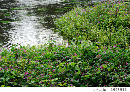 湖畔に咲くツリフネソウの花と若い種子・横位置