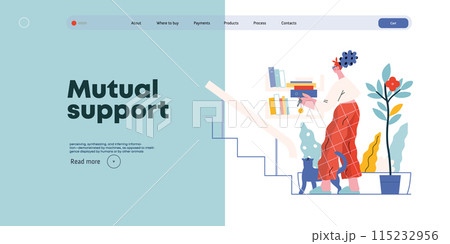 Mutual Support: Book Swap -modern flat vector concept illustration of a woman leaving books on a shelf in hallway for neighbors A metaphor of voluntary, collaborative exchanges of resource, services
