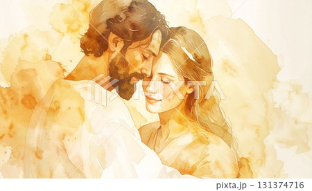 Watercolor painting of a man and woman embracing with tender expressions, rendered in warm earthy tones. A gentle illustration of love, intimacy, comfort, and emotional connection on textured paper