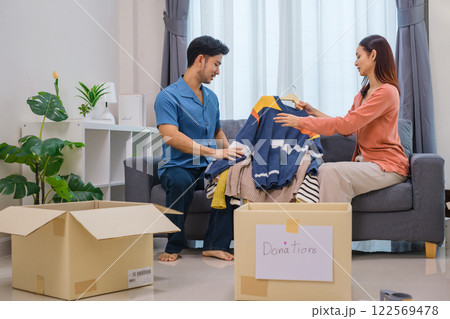 group of friend sorting and packing clothes into a donation box.community support, and charitable giving