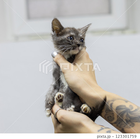 A veterinarian carefully holds a small homeless kitten, providing it with care and comfort in a clinical setting, demonstrating compassion for animals. Homeless kitten in the hands of a veterinarian.