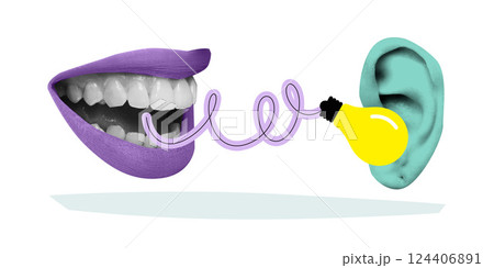 Mouth connected to ear by curly wire and lightbulb, visualizing full cycle of speaking and listening