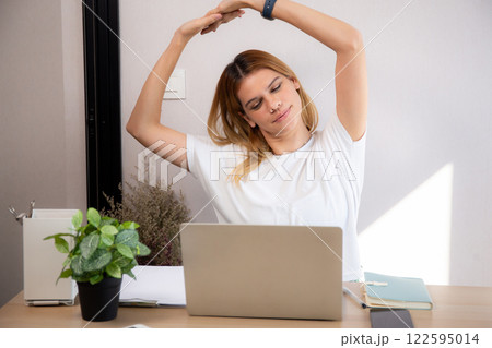 Portrait young caucasian businesswoman taking a break after overworked with stretching arm.