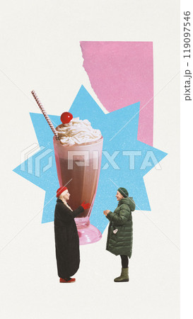 Contemporary art collage. Women in winter outfits stand by giant hot chocolate topped with whipped cream and cherry. Cold meets winter fun.