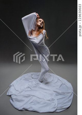 Graceful dancer wrapped in flowing fabric poses dramatically in studio setting