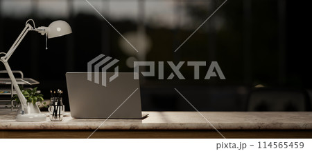 A laptop computer on a marble table in a modern dark office at night.