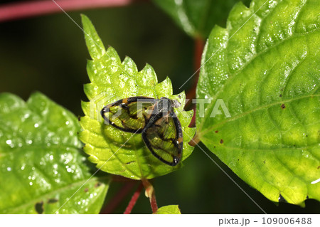 青葉の裏におしゃれでかわいいベッコウハゴロモの成虫(自然光&ストロボ・マクロレンズ接写)