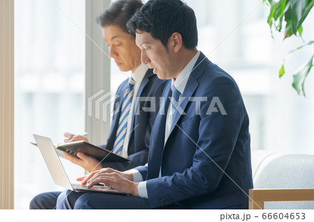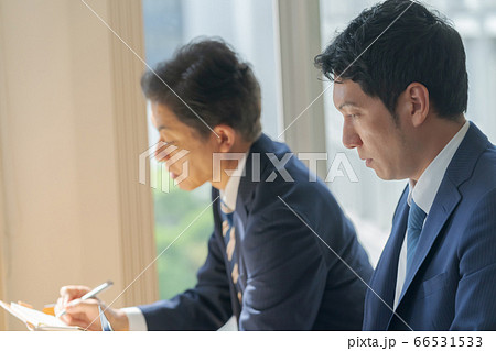 スマートフォンを操作するビジネスマンとビジネスウーマン