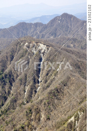 丹沢の世附権現山からの展望 崩落した山肌に丹沢主稜と石棚山稜