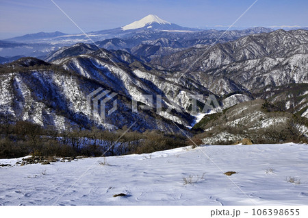 厳冬の丹沢山地 雪の塔ノ岳山頂より望む富士山