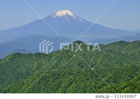 丹沢の不動ノ峰より望む初夏の富士山と緑の山地