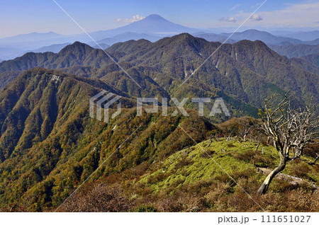 紅葉の丹沢山地 蛭ヶ岳山頂より望む富士山と秋の丹沢