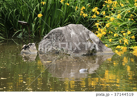 名主の滝公園(北区王子) 亀と黄菖蒲