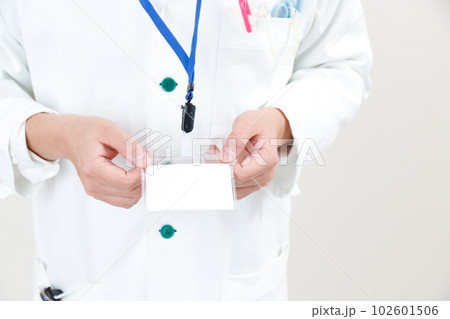 ネックストラップの名札を持つ医師、薬剤師。資格取得、自己紹介イメージ