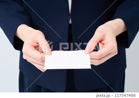 名刺を渡すスーツ姿の女性の手元