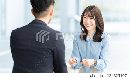 名刺交換する女性会社員