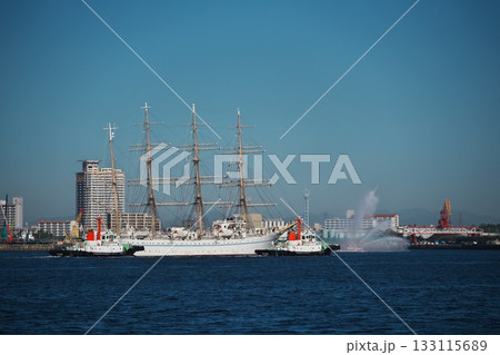 タグボートに押されてガーデンふ頭臨港に接岸する日本丸