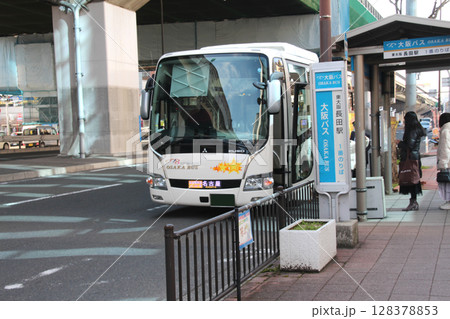 JR松江駅のバス乗り場に停車して乗客を迎え中の名古屋行き夜行バス