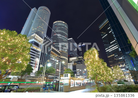 名古屋都市風景 名古屋駅前ロータリーと夜桜