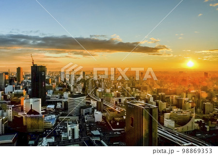 朝日を受ける名古屋市街地を見下ろす