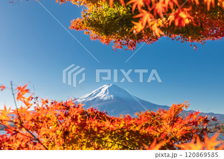 《山梨県》河口湖・湖畔の紅葉と冠雪した富士山