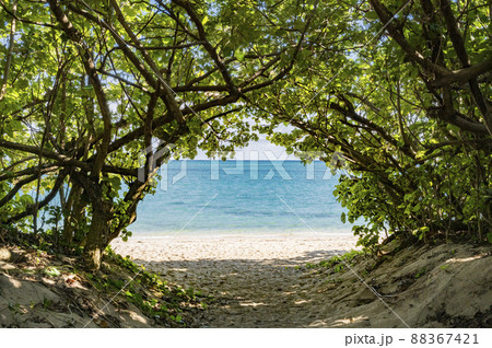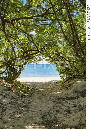 【背景】宮古島の有名観光地で南国バカンス・東平安名埼岬の緑の植物が作る自然の小道(沖縄県宮古島市)