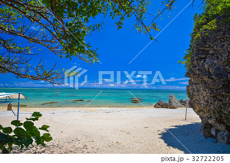 砂浜と海 沖縄県南城市 百名ビーチ サンゴ礁 青空 晴天 昼間 横