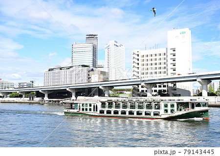 夏空広がる隅田川 青空の下隅田川を降る水上バス 隅田川名物水上バス