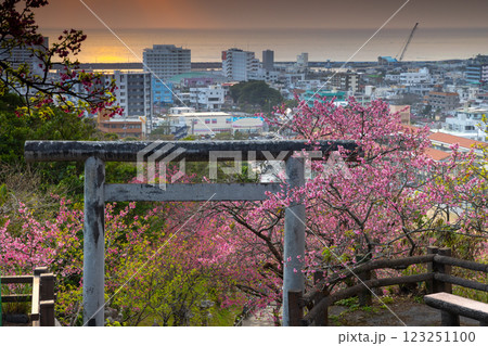 沖縄県名護市 名護城公園内名護神社の参道の鳥居を彩る早咲きの琉球寒緋桜と名護湾越しの夕陽