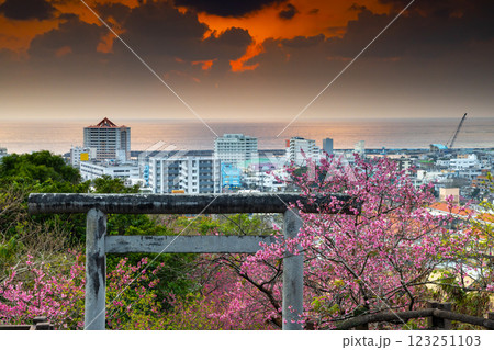沖縄県名護市名護 名護城公園内名護神社の鳥居の琉球寒緋桜と眼下に見下ろす名護の街と名護湾
