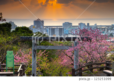 沖縄県名護市 名護城公園内名護神社の鳥居を彩る琉球寒緋桜と名護湾を照らす夕陽の道と天使のはしご