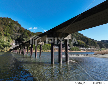 ドローン空撮。初夏、快晴の名越屋沈下橋と仁淀ブルー。高知県吾川郡いの町