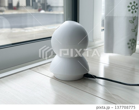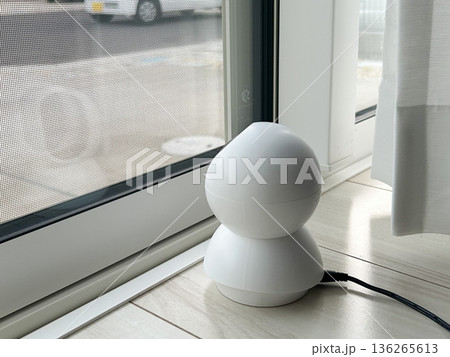 床に置いた置き型回転式防犯カメラ(窓外をのぞく)