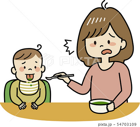 離乳食をあげるママと赤ちゃん(吐き出す)