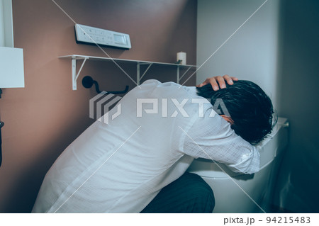 吐き気 二日酔い 気持ち悪い 男性 ポートレート 男の人 リビング コピースペース