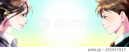 横顔の社会男女が向かい合うイラスト、無季、シンプル背景、中央スペースに空欄あり