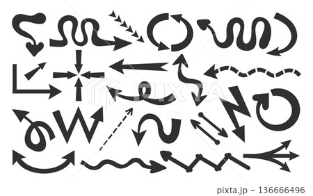 Dynamic arrows doodle set. Various playful arrow. Colorful swirl marker forms, pointing vector isolated elements for presentation