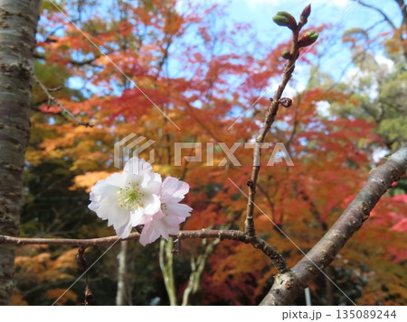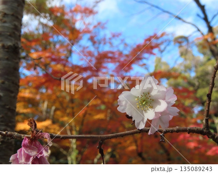 季節外れに咲いた桜と紅葉の背景