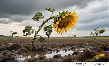 Sunflowers Bending Under Dark Clouds in a Muddy Field During an Overcast Day