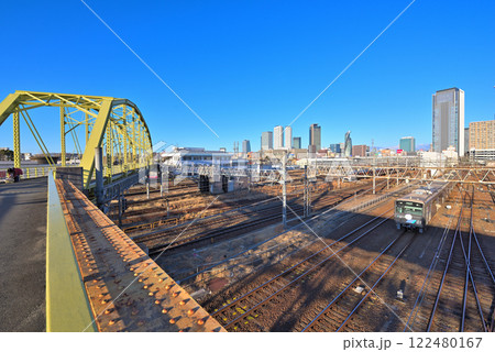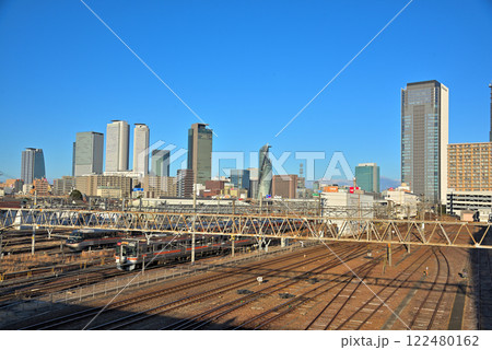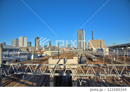 《愛知県》名古屋都市風景 中村区向野橋と高層ビル群とJR東海名古屋車両区