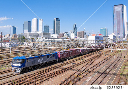 名古屋都市風景 向野橋から名古屋駅中心部高層ビル群とJRF JR貨物列車を望む