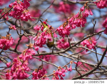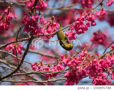 下を向いて咲く寒緋桜の蜜を吸うメジロ