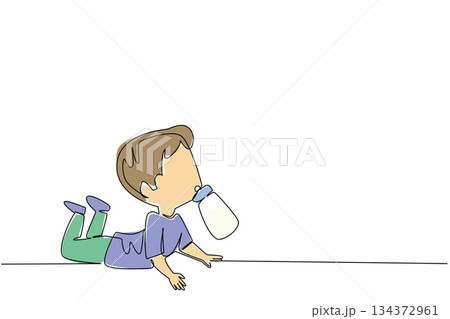 Single line drawing of a baby boy lying on the floor on his stomach while drinking milk from a bottle, symbolizing childhood care and family love in a parenting concept. Feeding toddler.