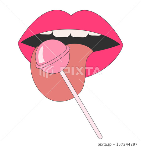 Lollipop, woman closeup and mouth with makeup, cosmetics and gen z style eating a sweet candy. Lips, young person and studio background with mockup and female model with sweets and fashion aesthetic