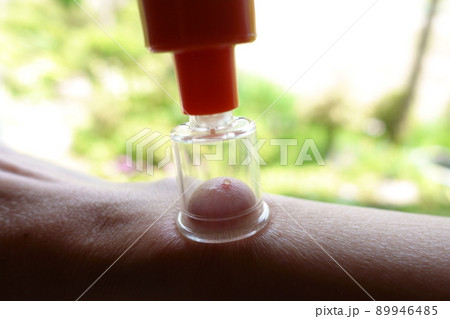 毒吸引機、ポイズンリムーバーで虫刺されの毒を吸いだす様子