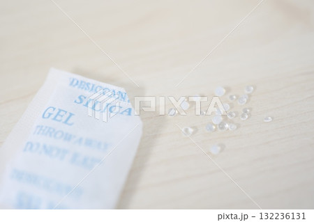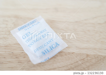 袋に入ったシリカゲル乾燥剤のクローズアップ。