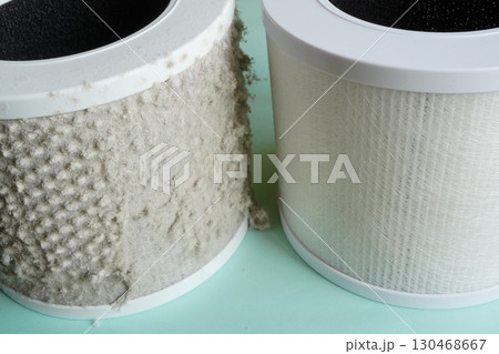 新品とホコリで汚れた空気清浄機フィルターの比較写真
