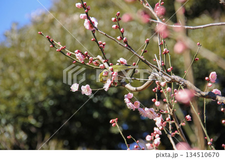 旧芝離宮恩賜庭園の梅の花とメジロ|春を告げる日本庭園の野鳥風景