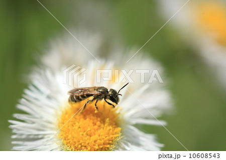 生き物 昆虫 ハルジオンとアカガネコハナバチ、足が花粉まみれです