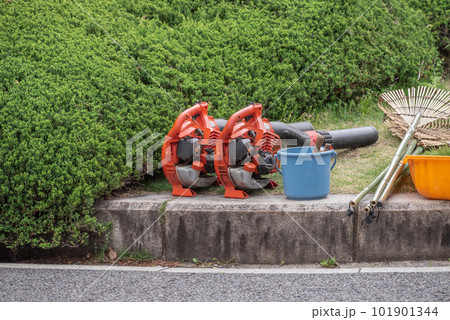 ヘルメットと作業服の植木職人が剪定した小枝をブロワーで吹き飛ばしている